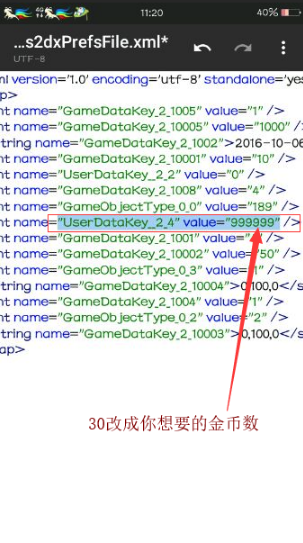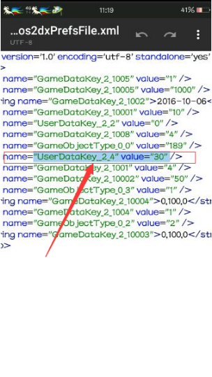 5.打开Cocos2dxPrefsFile.xml ,标示的那一行意思就是用户的金币价值是多少,我们之前的是30