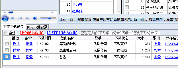 下载歌曲时,默认的是正在下载的记录。如果你想了解你以往的下载情况,请点击"历史下载记录"按钮。点击"历史下载记录"按钮后,你以前的下载记录将清晰的显示在下边.然后你可以选择你想要听的歌曲,点击"播放 所选歌曲"按钮,就可以对您选择的所有歌曲进行播放。同时,你也可以选择你不想保留在历史下载记录里的歌曲,然后点击"清除所选下载记录""清除文件不存在的下载记录"按钮,对你不想保留的歌曲进行删除。