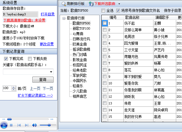 6、点击最上边的"歌曲排行版"按钮,进入歌曲排行版页面。下图为“歌曲TOP500”排行版 。选择喜爱的歌曲后,点击“下载所选歌曲”按钮,即可下载相应的歌曲 (自动将下载下来的歌曲重命名为“歌手名-歌曲名.*”,保存到您设定的目录中 ,排行版歌曲下载可将歌曲排名序号保存到文件名中,即“序号-歌手名-歌曲名.*”。 并可设置歌曲保存的子目录,方便歌曲的分类,可以以下面三种方式设置子目录:1、歌手姓名,2、排行版名称、3、用户自建。)