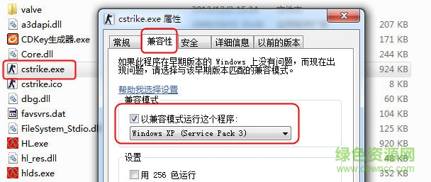 4).如果是WIN7用户:右键点击cstrike.exe属性,选择兼容模式,兼容XP,管理员运行。