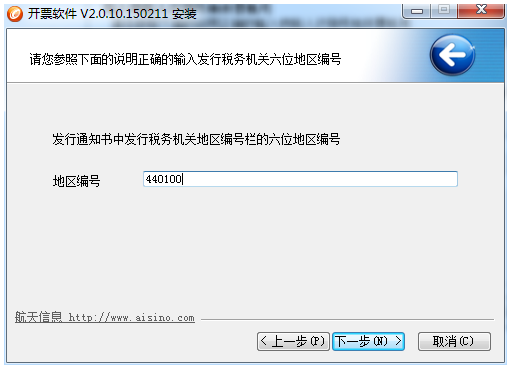 需按发行通知书上的地区编号正确输入。若金税盘已连接,则系统自动从金税盘中读取地区编号,无需用户手工输入。