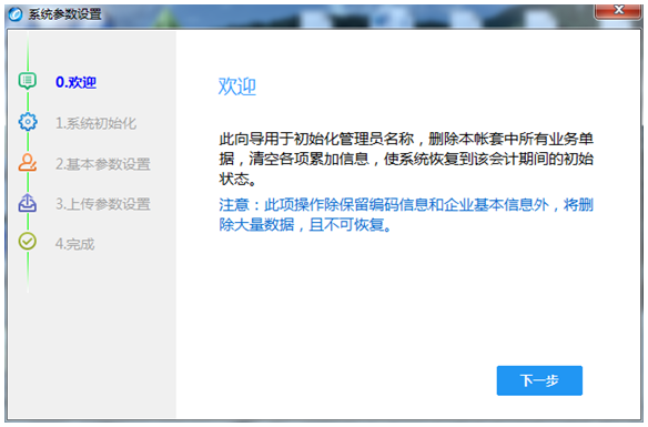 首次启动后软件将出现初始化向导,按步骤进行初始化,信息如实填写。