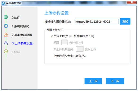 到上传参数设置的时候将安全接入服务器地址设置为https://59.41.129.23:444,输入的时候请注意不能使用中文标点符号。