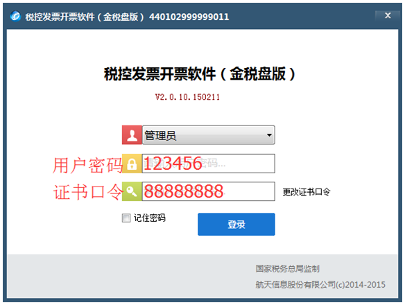 启动开票软件后出现以下界面,首次安装时用户密码默认为123456,证书口令默认为88888888,输入完整后点击登录。