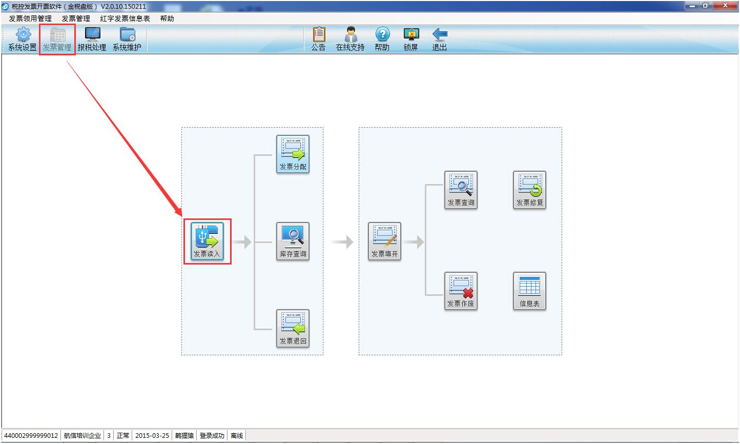 迁移数据后打开“发票管理”界面点击“发票读入”读入剩余空白发票