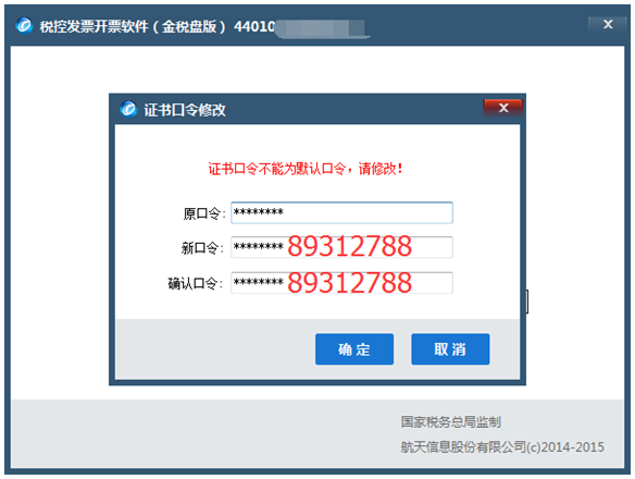 此口令设置后不建议修改,在累计连续5次错误后,证书将会锁死导致无法开票;