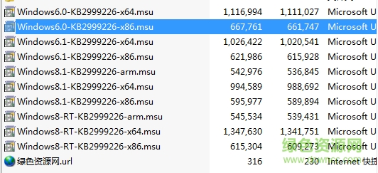 里面包含Win7、Win8.1、win10三个系统x86、x64的kb2999226补丁,三者补丁的开头分别是Windows6.0、Windows6.1、Windows8.1,别安装错了。例如如果是64位Win7,安装Windows6.1-KB2999226-x64那个就可以了。