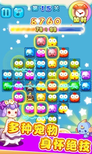 游戏以倒计时方式速度节奏快,设置多种不同萌宠画面清晰可爱,消除时超炫3D粒子特效美轮美奂