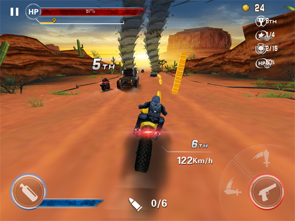 暴力摩托3是一款非常惊险刺激的手机摩托赛车游戏。玩家需要用尽一切办法完成任务,夺得第一,即使是使用血腥,暴力的手段也在所不惜,砍刀,手枪,火箭筒都可以成为你获胜的关键,游戏采用重力感应的方式来控制摩托车左右移动,并且摩托会自己向前行驶,玩家只需要使用氮气加速或者攻击对手即可,是一款非常暴力刺激的竞速游戏,感兴趣的朋友们快来下载吧!