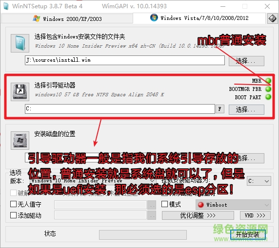 引导分区的意思就是我们windows要启动先要引导,引导信息一般都存放在分区中,通常情况下,普通安装的windows系统引导信息都存放在系统分区,也就是我们俗称的c盘,但是uefi安装就不一样,引导会存放在esp分区,这个我们要灵活选择。至于是普通安装还是uefi安装,nt都会有提示