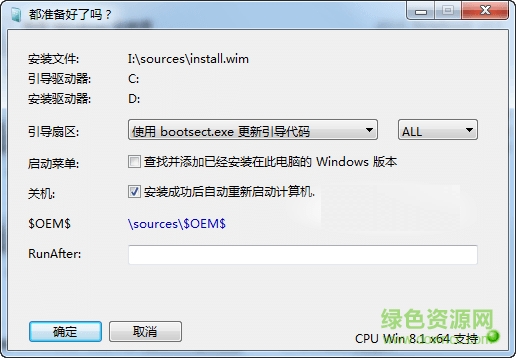 10、这时会弹出“都准备好了吗?”窗口,选择“使用Bootsect.exe更新引导代码”,如果想要与电脑上现在已有的系统组建成双系统或多系统,则需要勾选“查找并添加已经安装在此电脑的Windows版本”,建议勾选“安装成功后自动重新启动计算机”,最后点击“确定”即可开始安装。