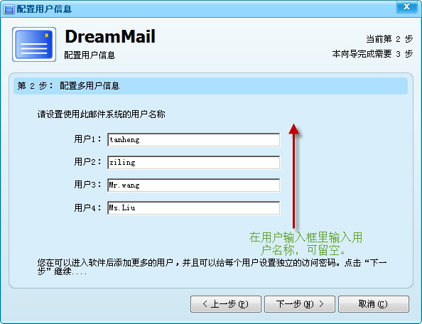 2、点击下一步,进入用户名称配置,最多可以输入四个用户使用,如图示: