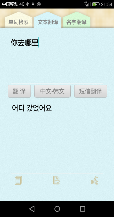中韩对译2016 app是一款中韩会议类手机软件,软件界面简洁,支持但系检索、文本翻译、名字翻译,还可以查看相关的扩张词,让你轻松的理解,还可以分享给小伙伴哦,喜爱的朋友赶快到绿色资源网下载体验吧!