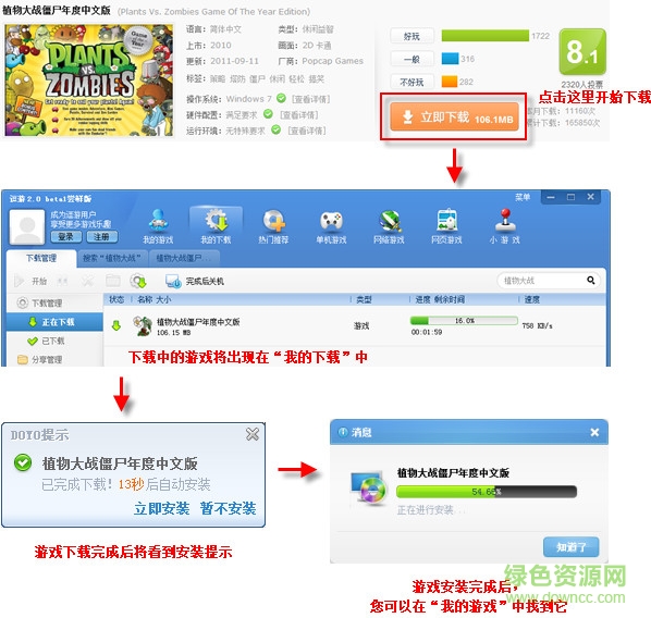 在逗游网中,单机游戏和网络游戏是需要下载并安装后才能玩的,下图将为您演示下载及安装过程。