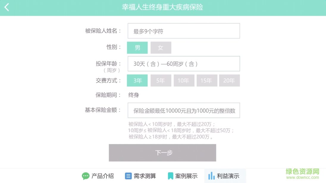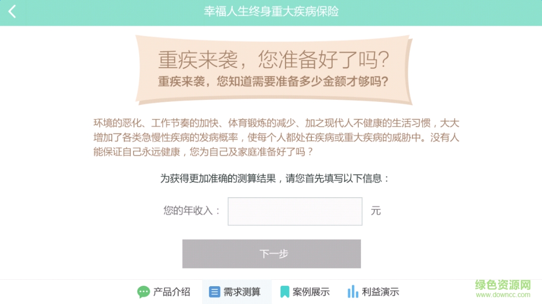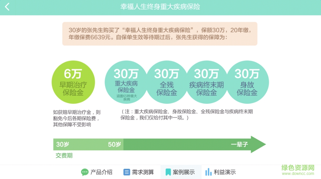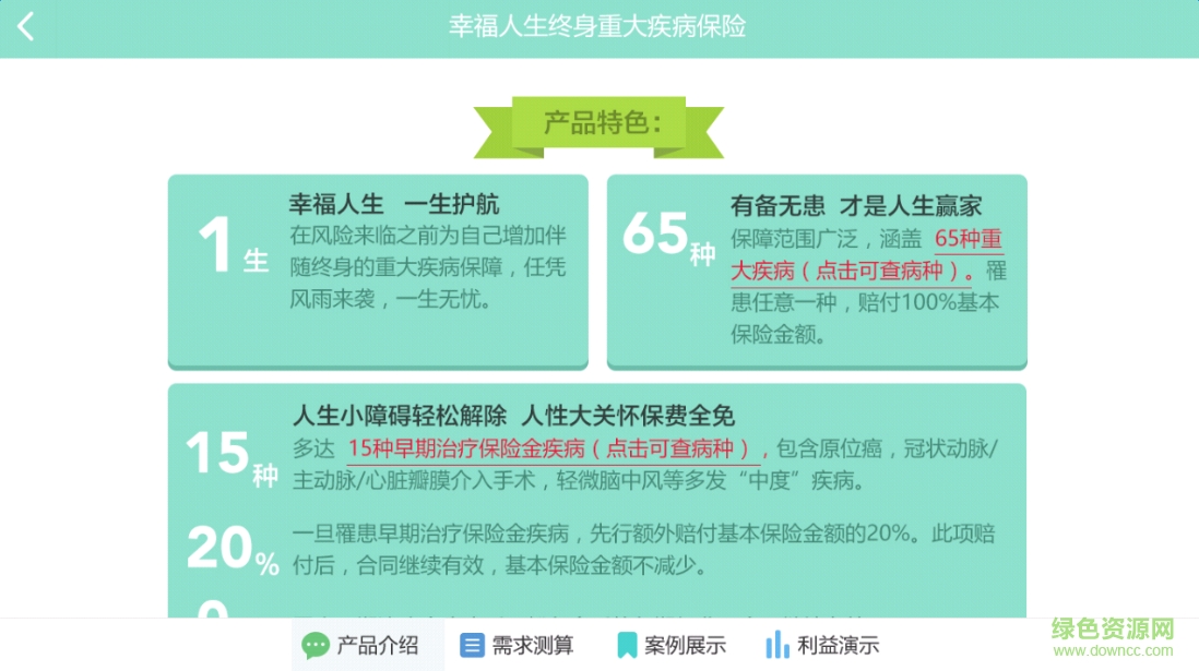 3.帮助客户计算终身重大疾病保险投保金额的实用工具,以“快速、全面”为服务理念,为您提供移动式自助计算服务。