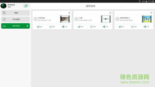 强大的云素材空间,对接所有的多媒体平台,解决上传视频难、慢、空间大等问题,分享课程资源链接,便于网络传播、展示、分享,十分钟2MB微课不需要过多流量,实现快速便捷上传,发送至学生、班级、学校,随时获得学习资料,可以点赞、评论、收藏,支持手机/PAD/PC端接收。