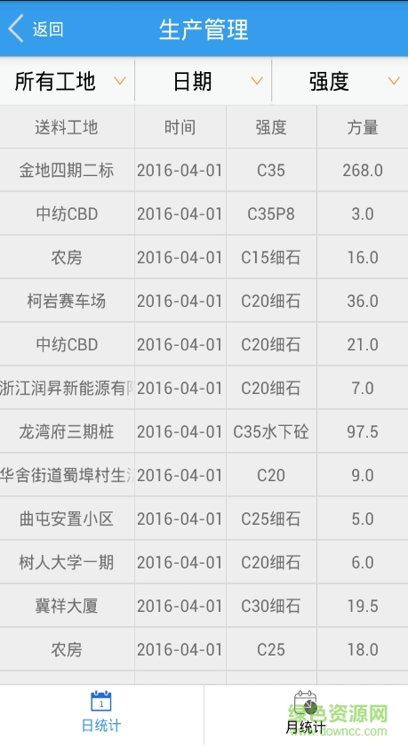 2.生产管理:按日和按月统计企业生产混凝土的数据。