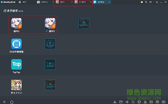 2.在多开助手界面,选择您要多开的应用或游戏,选项后,会在软件顶部有你多开的软件。