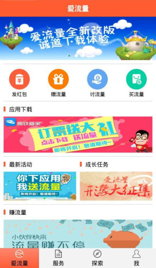 目前主要实现功能有:赚流量、发红包、赠流量、买流量、充入手机、好友管理等,可以满足用户对获取免费流量、好友间流量分享以及解决流量月底清零等诸多需求。爱流量内的流量有效期全部为180天,打破月底流量清零模式,解除用户后顾之忧。