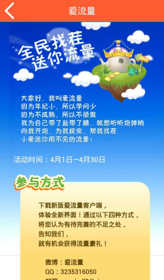 爱流量是中国移动面向大众用户推出的一款在线流量交易平台。在这里,用户可以参加丰富多样的活动赚取免费流量,也可以将流量共享,实现好友间的流量分享,是免费赚取流量得神秘利器!