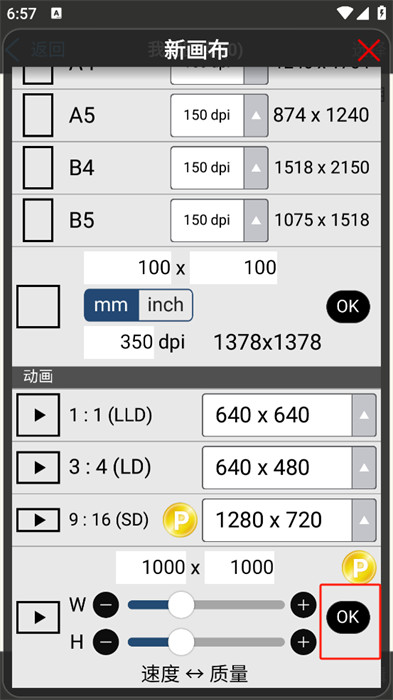 4、最后在设置完长宽高之后,向下滑动,可以看到【ok】按钮,点击就能进行作画啦!