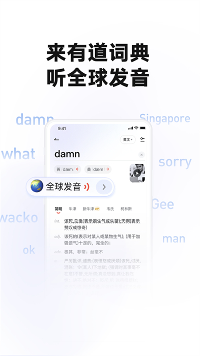 - 地道发音:支持单词、例句发音、全球发音,体验纯正英语发音。