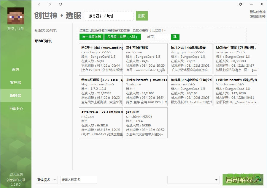 我的世界创世神启动器是一款提供我的世界服务器、客户端、MOD等内容库阿斯登陆和服务器定制的软件,帮助玩家选择喜欢的游戏版本快速玩游戏,需要的玩家快来绿色资源网下载吧!