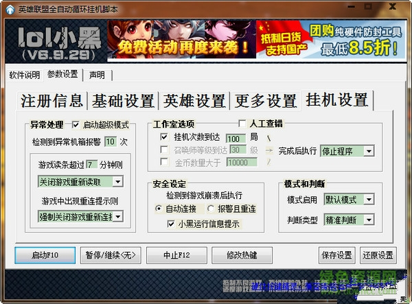 游戏介绍 游戏标签: LOL辅助 英雄联盟全自动循环挂机脚本是一款功能强大的自动挂机辅助工具,可以帮助玩家在游戏中突然有事离开时使用,不会让系统检测到你已挂机,安全无毒,欢迎有需要的用户自行下载。软件简介:英雄联盟全自动循环挂机脚本(全模式版)人机对战、扭曲丛林、嚎哭深渊、统治战场,自动无限循环,挂机刷金,刷经验。可以自定义英雄,自定义装备,自定义模式。功能特色:【统治模式智能占塔,战斗模拟电脑AI操作,减少封号机率】【自动建房,自动匹配,循环战斗,刷金币刷经验】【智能买装备,智能出技能】【全后台,一边挂机一边聊qq,看电影,玩游戏】【自定义,人机,统治模式支持】【支持更多英雄】【老牌作者打造最稳定,最强脚本】 游戏截图 上一张下一张(1 / 1) 安装详细截图 猜你喜欢 英雄联盟 英雄联盟 英雄联盟(lol)是由美国Riot Games开发的一款竞技网络游戏。游戏系统极为丰富,包括匹配系统、排位系统、天赋系统、符文系统等,还有各种玩法,以及提供上百位不同特色的英雄选择,让英雄联盟独具特色。目前而言,LOL已经成为最具人气和影响力的网络游戏之一。赶快下载体验吧! 查看更多>> 英雄联盟手游高帧率软件 2.99M/中文/10.0/v1.1 安卓版下载 英雄联盟先游体验服(英雄联盟手游云游戏) 35.28M/中文/10.0/v5.0.0.3990204 官方安卓版下载 英雄联盟手游国际版ios 3667.12M/中文/10.0/v5295 官方最新版下载 英雄联盟手游帧数修改器 1.56M/中文/10.0/v1.0 安卓版下载 掌盟最新版安装包 155.57M/中文/10.0/v10.0.4 安卓官方版下载 英雄联盟手游助手手机版(掌上英雄联盟) 166.96M/中文/10.0/v10.10.3 安卓最新版下载 其他版本下载 标题 大小 更新日期 下载 下载地址 电脑版 英雄联盟全自动循环挂机脚本 v6.9.29 小黑修改版 点击报错 软件无法下载或下载后无法使用,请点击报错,谢谢! 关闭报错反馈 请描述您所遇到的错误,我们将尽快予以修正,谢谢! *必填项,请输入内容 本类最新 美食大战老鼠小迪辅助 v8.2 最新免费版 4399洛克王国东哥辅助最新版 v13.09 全能版 英雄无敌3地图编辑器中文版 v1.1 汉化版 炉石团子hdt插件 v0.9.3 最新版 魔兽世界网易有爱插件 v3.4.2.32834 官方版 我的世界hmcl启动器 v3.5.2.216 最新版 相关文章 MySQL数据库的自动备份与数据库被破坏后的恢复 无线路由器自动断网重拔的故障处理 笔记本电脑自动关机故障 开机10分钟左右就自动关机 XP,怎样设置才能在开机启动后,跳过账户和密码,直接自动登录桌面 解决无线网卡无法自动分配IP地址的问题 用户评论 热门评论 最新评论 发表评论 查看所有评论(0) 昵称: 请不要评论无意义或脏话,我们所有评论会有人工审核. 字数: 0/500 (您的评论需要经过审核才能显示)