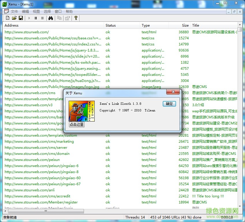 Xenu用于检测网站链接有效性的绿色软件,使用简单,最大支持100线程( Parallel threads),检测速度非常快.在对某网站的6层连接100630个连接进行检测时,使用默认的100线程耗仅费了1小时40分钟.当然耗费的网络资源比较多.