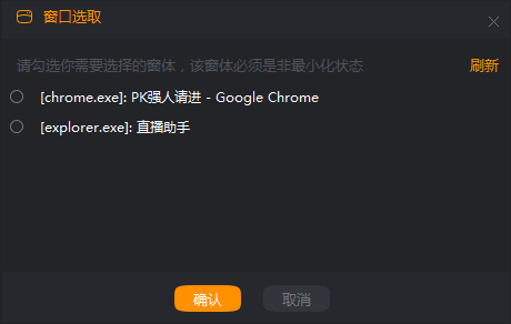 直播伴侣在窗口选取弹窗中能读取你电脑上打开的所有页面,选中想要直播的窗口点击确认即可将窗口添加至直播窗口列表。(为了程序正常读取窗口,请保证待读取窗口非最小化)。