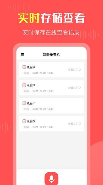 彩映录音机是一款专门用来录音的app,在软件里面,你可以将自己的声音录制下载,通过独特地储存录制方式能够十足保真,音质也是超级棒的,而且还有降噪等功能,无论是开会记录还是唱歌,都能够起到很好地作用,如果感兴趣的话可以来本站下载!