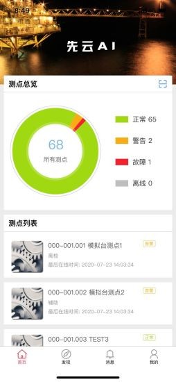 先云软件是拥有着先进的智能ai的手机软件,在这里用户能够进行工业设备的故障预测和监测功能,帮助广大的机械和工业的行业的人员进行各种机械的检测,大大降低事故发生的可能性,守护每一个工人的安全。还能够进行远程巡检、预警、统计等等功能,非常的实用。