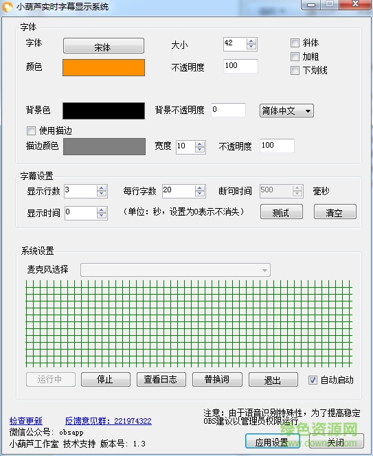 小葫芦obs实时字幕插件是一款在直播时用来设置和编辑字幕的软件,能将语音转换成文字显示,帮助主播们更好的调控直播界面来达到更好的互动效果,绿色资源网诚意推荐!