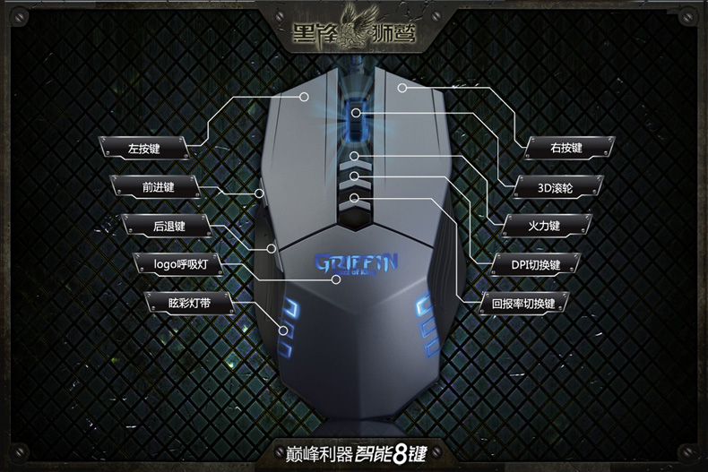 黑爵黑锋狮鹫游戏鼠标在通电后便会发出炫目的蓝光,无论是鼠标上的LOGO还是鼠标中的细缝以及鼠标背部的细小矩形图案都会发光,并且,灯光还能够根据鼠标的DPI的变化而变化,从而发出蓝色、红色、绿色的炫目光芒。