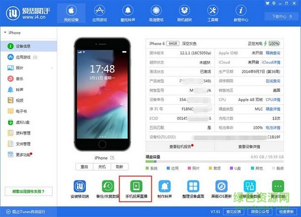 安装完以后将设备连接到电脑。此时您可以在爱思助手【我的设备】最下方找到【手机投屏直播】工具,请点击打开;