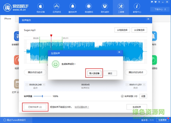 四、生成铃声成功后点击“导入到设备”即可将制作的铃声导入到移动设备中,已制作的铃声可以在左下角查看。