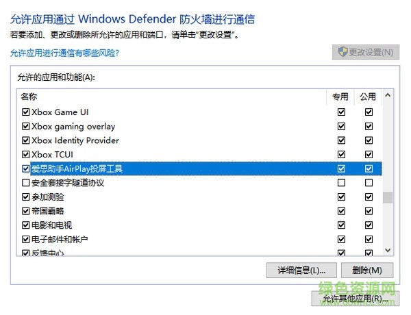 4、此时如果无法连接,请到【控制面板】---【所有控制面板项】---【Windows 防火墙】---【允许程序或功能通过windows防火墙】中找到【爱思助手AirPlayer投屏工具】和【Bonjour】并打勾;