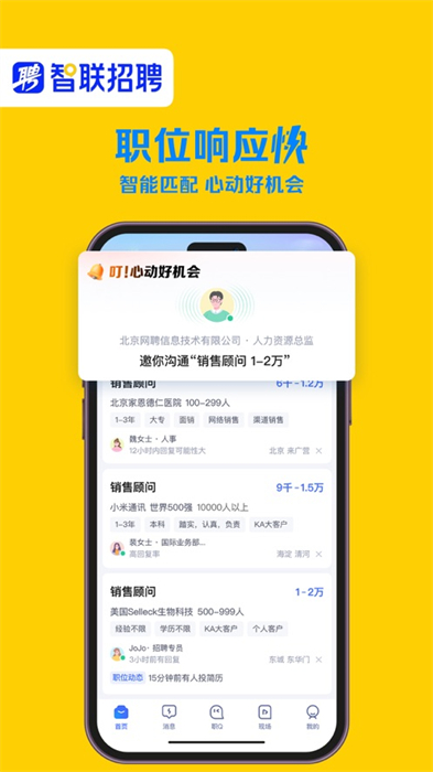 智联在手,工作我有!史上更难就业季,智联招聘依然给力!海量最新最真实的工作机会随时投递,理想职位分分钟到碗里!手机上智联,求职超方便,靠谱工作随“薪”选!