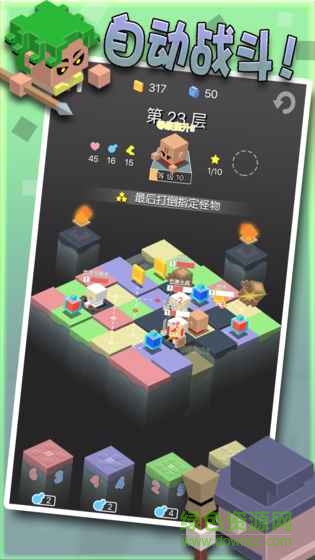 游戏故事发生在一个神秘的世界,这个世界由四大魔法元素组成,我们的主角是方头方脑的人物形象,看起爱除了可爱之外,还颇具搞笑的感觉。游戏画面背景色调清新,主战场则是一片色彩斑斓的方块地区,我们的主角将在方块地图上进行类似棋子的走动,在到达终点位置的同事,可以消灭地图中的怪物,以及收集各种道具资源。游戏画面采用3D立体风格呈现,方块模样的世界格局让整个游戏看起来更有战旗的感觉,色彩清新而丰富,颜色搭配多姿多彩,视觉上给人一种清新亮丽的感官效果。