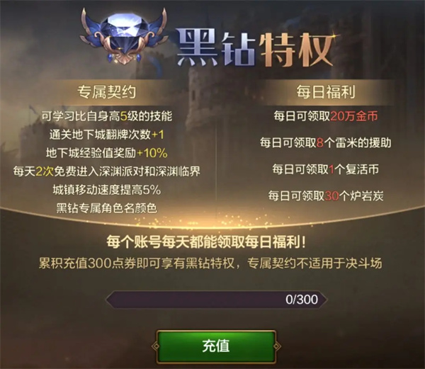 适用范围:账号下全角色共享黑钻特权,同时四角色的三养一玩法能够最大化黑钻收益