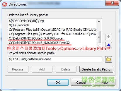 2、接下来将Source目录和DX4目录添加到DelphiXE4的Tools->Options…->Library path中,基于DISqlite3的程序在编译的时候需要,如下图所示: