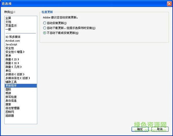 首先任意打开一个pdf文件,点击菜单“编辑”->“首选项”,在弹出的对话框中,找到“更新程序”一项,在“检查更新”栏目中选择“不自动下载或安装更新”即可。如下图所示。