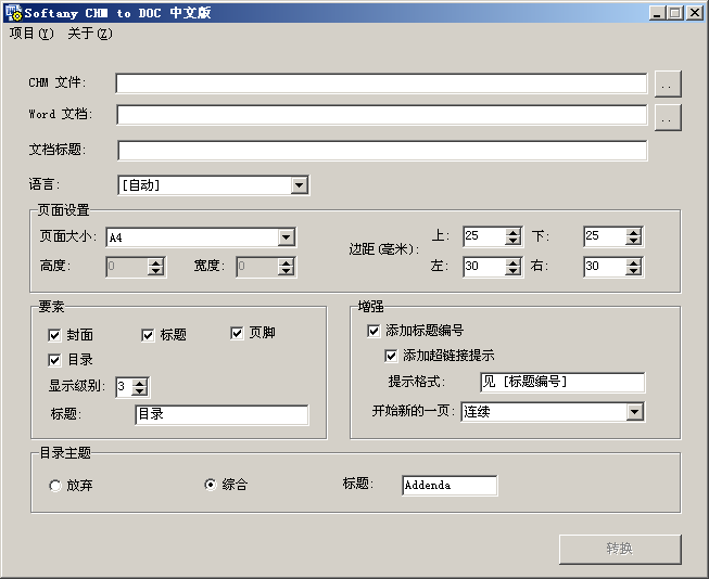 softany chm to doc是到目前为止在市场上最专业的chm转doc产品,它可以将 Windows html 帮助 (.chm) 文件转换成doc文件,并包含表的内容、页眉、页脚、页码、标题编号等!