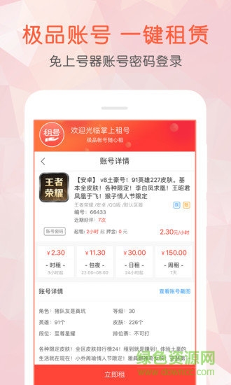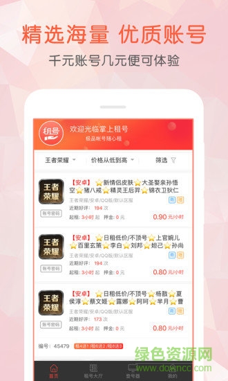 掌上租号app是专为喜欢玩游戏的朋友们提供的一个租号服务软件,无论你喜欢什么样的游戏,在这里都能租到你想要的账号,与好友开黑不再是问题,而且价格都比其它平台要更加的便宜实惠哦,有需要的朋友就请登录使用吧!