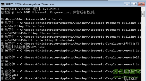 2.在命令窗口中输入del c:*.dot /s 并回车,运行完成后,即可正常打开word。
