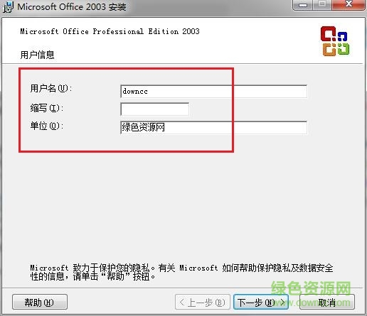 2.输入用户信息,随便输入都可以(如:用户名:downcc;单位:绿色资源网),点击“下一步”