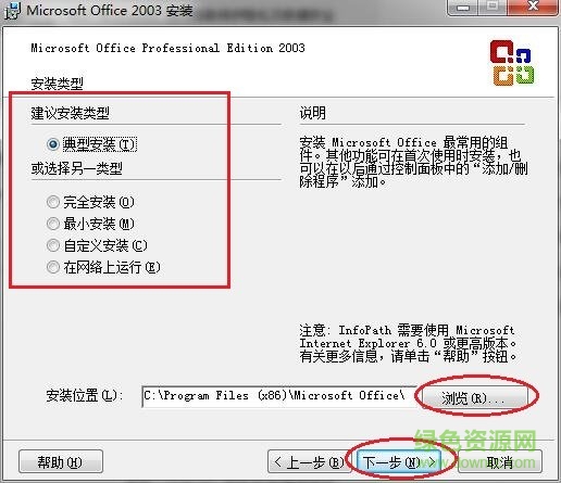 3.选择安装类型和路径(典型安装就是默认安装最常用的组件;完全安装是office2003所有组件都装,自定义安装就是选择自己需要的组件;下面浏览可以设置安装路径,默认在c盘,可修改到其他盘),点击“下一步”