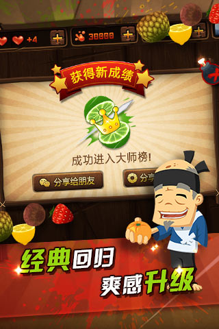 挑战玩法(核心玩法):挑战水果忍者大师排行榜上的玩家进行游戏竞技。