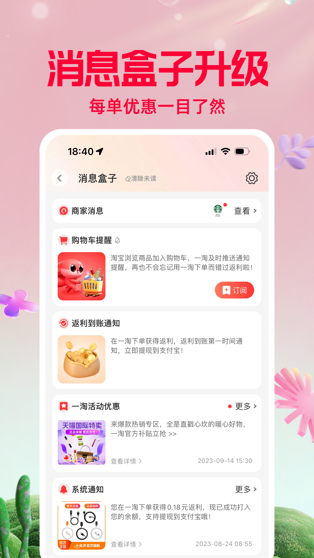 2、消息盒子升级:支持分类目免打扰管理,接入淘宝商家消息。