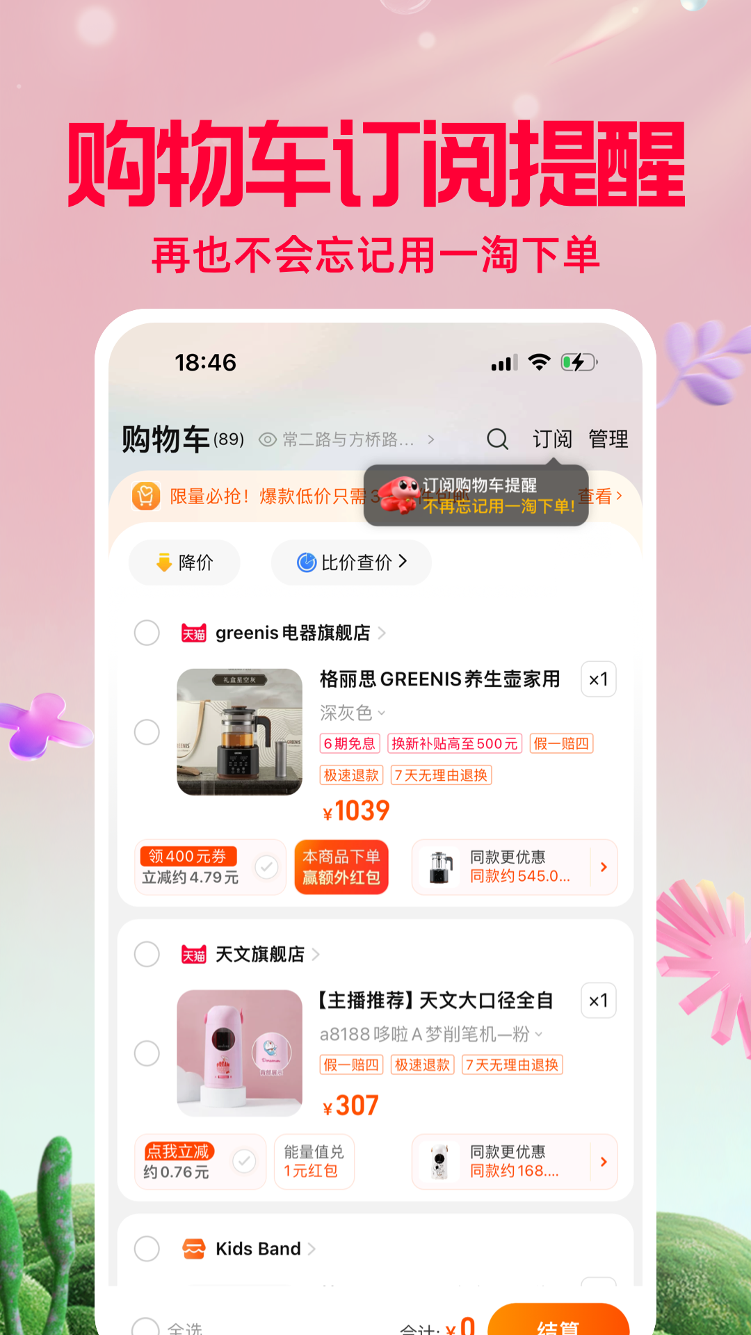 3、增加购物车订阅提醒,再也不会忘记用一淘下单!